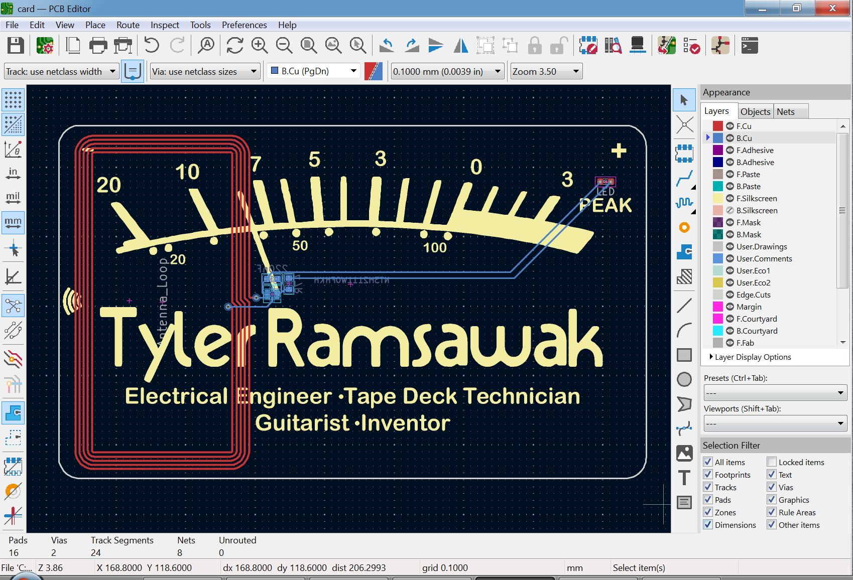 I also like to design my own electronics in KiCAD! I've made sooo many things, from simple stuff like amplifiers, to super complex multi-page 4G LTE telephones! I am actually in the process of redesigning my 4G LTE Motorola MicroTAC through the Blueprint program offered by Hack Club! It is unfortunately my last year of hack club, I would like to work for them!! Although I will become an EE, part of me wants to be a teacher for some reason. Mainly because I didn't have any electronics guidance in my formative years, and I'd like to help kids learn cool things (either an instrument or hardware). I can code, too, but not too well. Although I am good at Python and can barely write C. I am in a C++ class at school, so maybe I can get my embedded programs and real time operating systems ported to a better, faster language than Micropython. I love music and I collect vinyl!!!